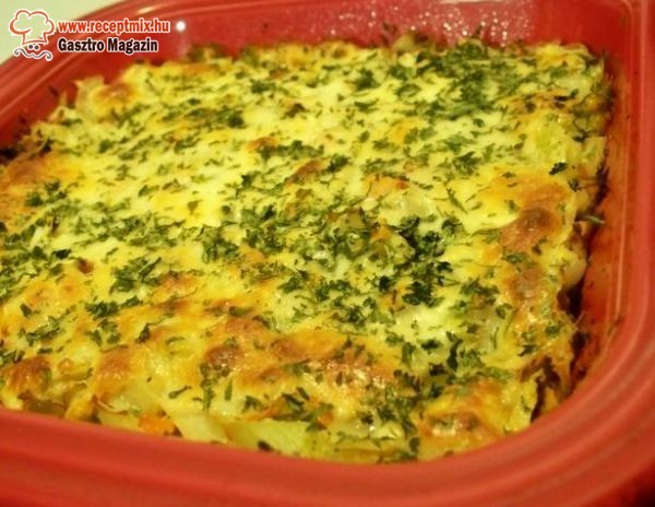 A fűszeres tejszínnel meglocsoljuk az előkészített sütőtál tartalmát, majd a maradék vajjal megszórjuk a tetejét, és némi borssal is fűszerezzük. 190 fokos sütőben kb. 20 percig sütjük.