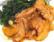 A csirkemellfilét és a combfiléket besózzuk, majd szárnyaspáccal is beszórjuk. A tepsialját olívaolajjal nagyon vékonyan kikenjük majd az almacikkekkel kirakjuk az alját. Erre ráfektetjük a csirkehúst és a tetejét is betakarjuk az almaszeletekkel. A húst én dúsítottam egy kis másnapról megmaradt hajdinapalacsinta tészta. A tésztát felcsíkoztam és ráraktam a húsra. Ezután kerültek rá az almaszeletek . Az almaszeleteket beszórtam őrölt tarkaborssal . Felöntöttem a fehérborral majd alufóliával letakartam és a hűtőbe raktam kb. félórára, majd a sütőbe került.