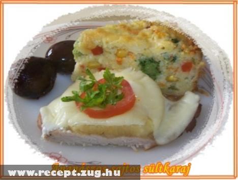 Hozzávalók: 8 szelet karaj 8 karika ananász befõtt 8 szelet sajt só bors olaj Elkészítés: A karajt klopfolóval jól megütögetjük, sózzuk, borsozzuk. Az olajon hirtelen szép pirosra kisütjük, rátesszük az ananász karikát, befedjük a sajttal. Forró sütõbe toljuk, de csak addig, amíg a sajt ráolvad. Köretnek tavaszi rizstortát készítettem hozzá. Jó étvágyat kívánok!